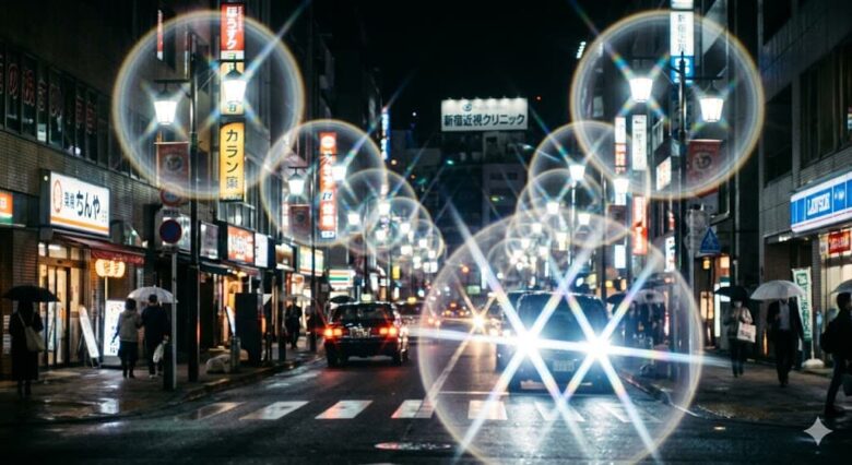 夜間の街灯や車のヘッドライトの周りに、光の輪(ハロー)やギラつき(グレア)が見える現象です。