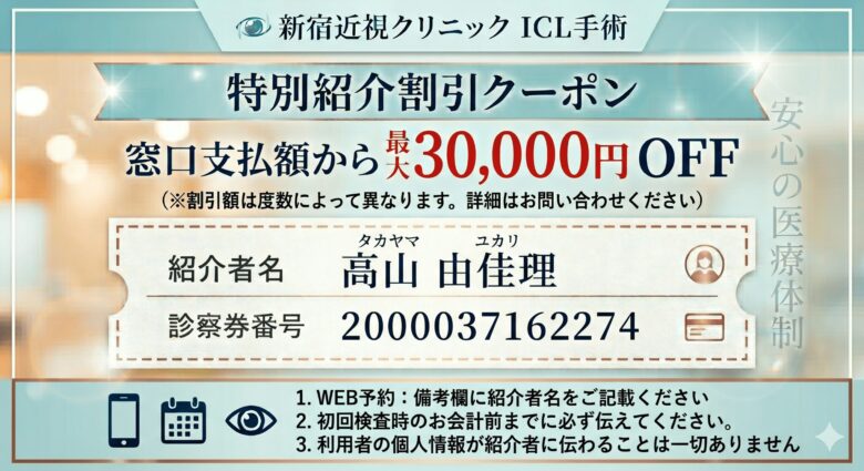 これ以上の値引き設定はないため、この「紹介割引」を使うのが、新宿近視クリニックで最も安く受けるための「最安値」です。